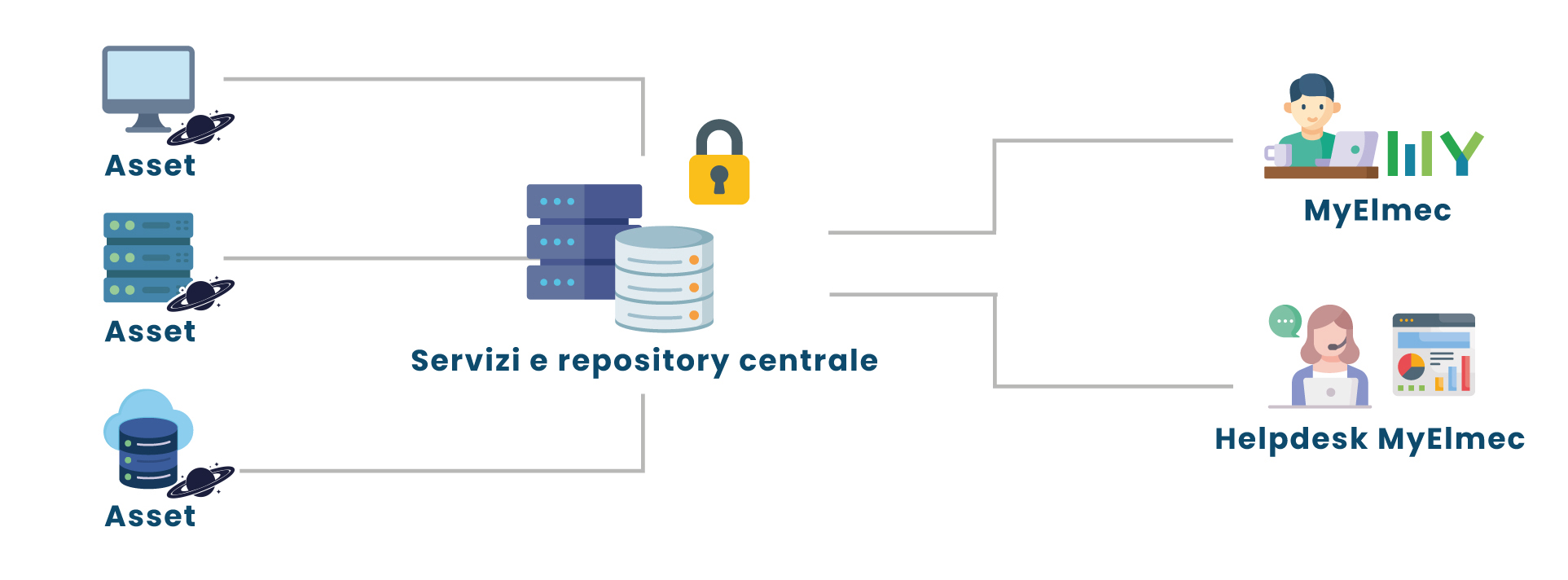 Ormis si collega a servizi centralizzati che effettuano la discovery di dati tecnici dell’asset e le rendono fruibili su MyElmec e al personale di supporto.